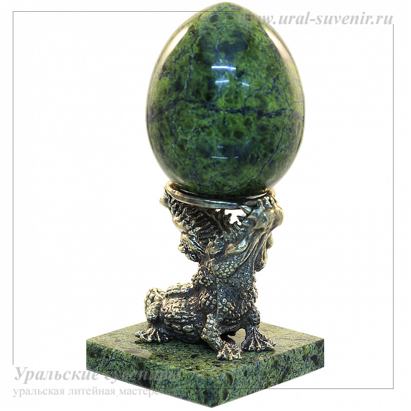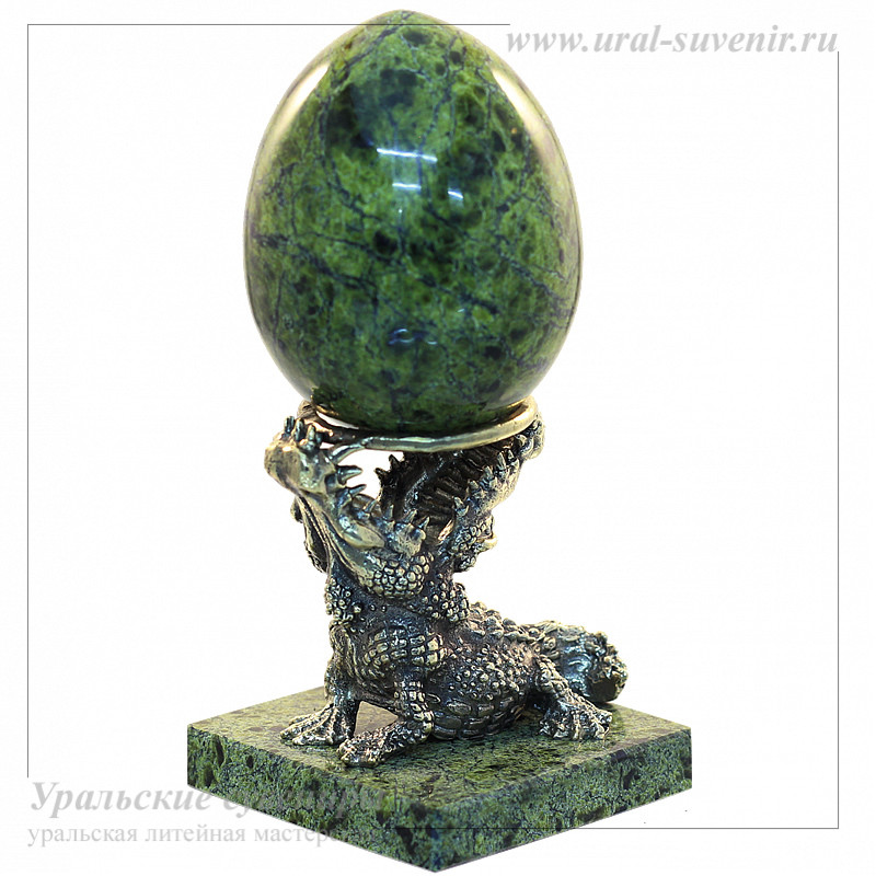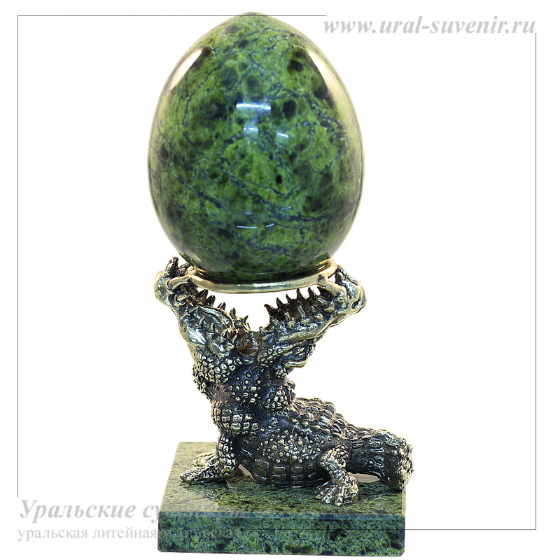 Яйцо из светлого змеевика, диаметр которого составляет 47 мм, а высота 60 мм, добавляет особый шарм этой подставке. Его имеет прекрасное сочетание с крокодилом и подставкой, создавая единую и гармоничную композицию.