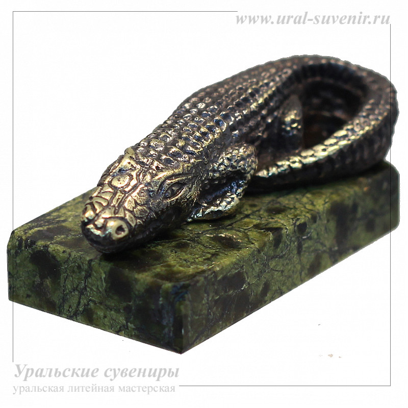 Представляю вашему вниманию уникальный сувенир от уральской литейной ремесленной мастерской - статуэтку маленького крокодила из литьевой бронзы с подставкой из змеевика. Этот прекрасный предмет ручной работы имеет размеры 60х30х25 миллиметров, что делает его идеальным для размещения на столе, полке или в коллекции сувениров.