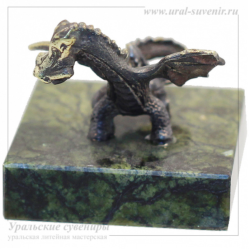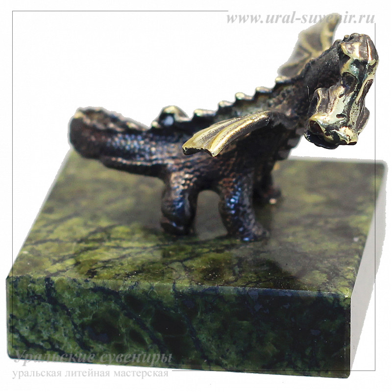 Подставка из змеевика придает статуэтке дополнительный шарм и элегантность. Этот природный камень, с его неповторимыми текстурами и оттенками, идеально сочетается с блеском бронзы, создавая гармоничное и стильное произведение искусства. Дракончик будет отлично смотреться на рабочем столе, в кабинете, на полке или даже в витрине, где его смогут заметить все ваши гости.