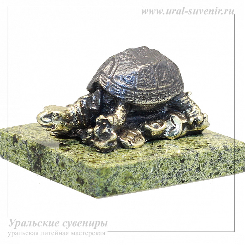 Представляем вам уникальную статуэтку Черепаха на деньгах, изготовленную из литьевой бронзы в уральской литейной ремесленной мастерской. Этот изысканный сувенир является прекрасным образцом народного художественного промысла уральских мастеров-ремесленников.