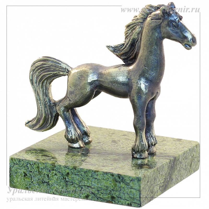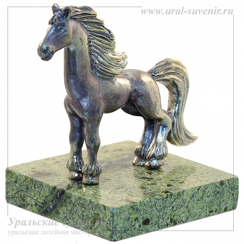 Представляем вашему вниманию уникальную статуэтку "Лошадка" изготовленную из литьевой бронзы в Уральской сувенирной мастерской. Этот прекрасный предмет искусства представляет собой изящную стилизованную фигурку лошади на подставке из светлого змеевика. Размеры статуэтки составляют 50х65х65 мм, что делает ее компактной и удобной для размещения на полке, столе или другом месте.