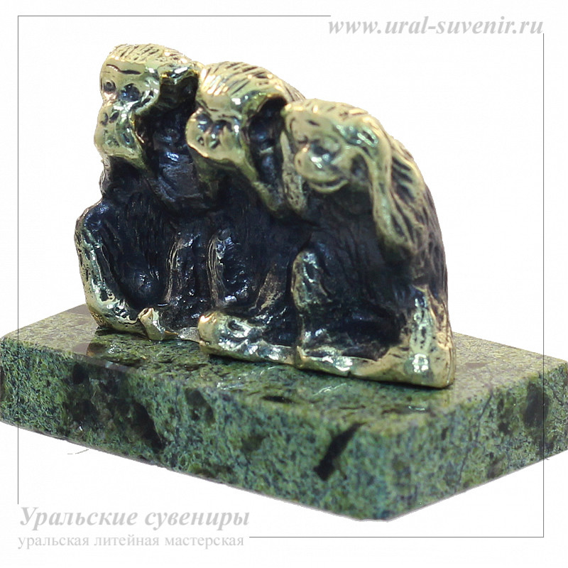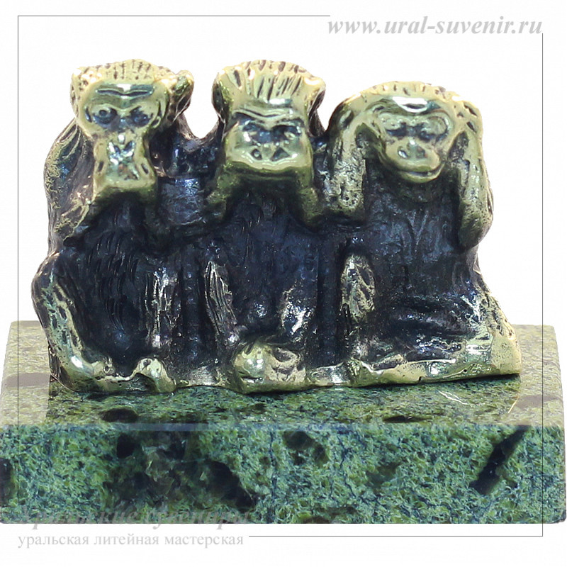 Статуэтка "Обезьяны трио - не вижу, не слышу, не скажу" - это изысканное произведение искусства, выполненное из литьевой бронзы и установленное на подставке из светлого змеевика. Размер этой статуэтки составляет 35х55х40 мм, что делает её компактным и стильным элементом декора.